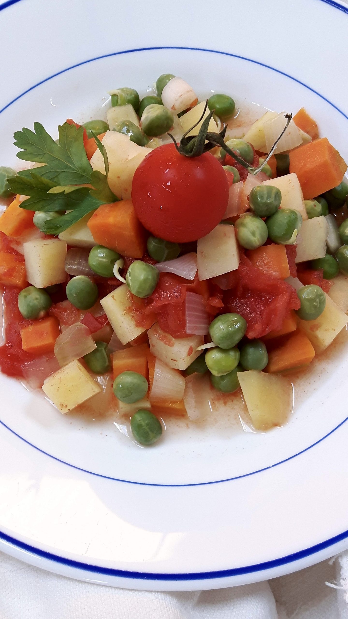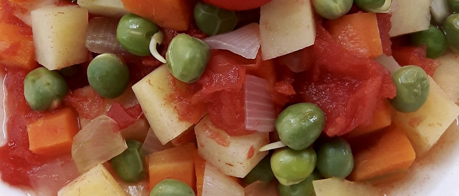 Das Gemüse im Topf mit Gemüsesuppe ablöschen, die Tomaten in den Topf dazugeben, alles umrühren und für 20 Minuten leicht köcheln lassen.